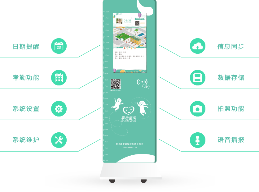掌心宝贝考勤机集智能拍照签到、考勤统计、语音播报等一体化功能,智能推送出入园信息,同时还配备了体温枪、车载考勤系统等幼儿安全保障硬件。安全好用,真正满足幼儿园需求。